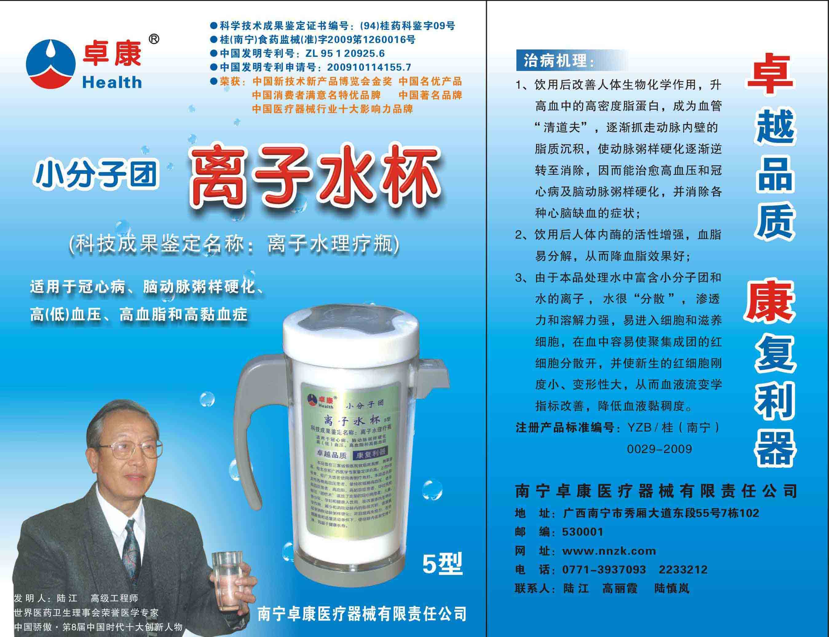 -----我是從事建筑的高工,本來沒有資格去攻克醫(yī)學(xué)難題,卻為了自身健康才扣響醫(yī)學(xué)的大門。由于我1990年患高血壓,因怕中風(fēng)才研究發(fā)明了離子水瓶,我把水處理成微小分子團水,飲用后治愈了高血壓。便于1993年底送到三家省級醫(yī)院做臨床試用4個月。經(jīng)北京和廣西醫(yī)學(xué)專家鑒定:"降脂降壓效果好"," 能擴大心腦動脈流量,改善心腦電圖以及微循環(huán)","對治療心腦動脈粥樣硬化、高血壓、高血脂有良好的醫(yī)療保健作用。""產(chǎn)品的技術(shù)性能和療效達到了同類產(chǎn)品的國內(nèi)領(lǐng)先水平,經(jīng)廣西醫(yī)學(xué)科學(xué)情報研究所檢索,未見國外有類似報道。"中國醫(yī)學(xué)科學(xué)院張正國教授從美國國立醫(yī)學(xué)圖書館數(shù)據(jù)庫存Medline檢索英俄文資料,均未見類似報告。2000年上市后,我為了對消費者負責(zé)而繼續(xù)觀察研究,一直通過《信譽卡》和《質(zhì)量跟蹤調(diào)查書》向患者承諾療效,請用戶使用6個月后反饋效果。和脂壓患者飲用2至5個月內(nèi),消除癥狀,停服藥物,血壓正常;冠心病患者飲用3~5個月逐漸減輕至消除心絞痛、房顫等癥狀,不再服藥,飲用1年左右心電圖正常,經(jīng)冠脈造影掃描無明顯狹窄,表明冠心病痊愈。大量患者還反映許多衰弱器官被修復(fù),讓前列腺增生、慢性咽喉炎、慢性氣管炎、支氣管炎、慢性胃炎、腸炎和膽囊炎等不藥而愈;2型糖尿病患者是因為胰島衰弱致病,飲用該水半年至一年,逐漸減藥至停藥,血糖尿糖正常,真正治愈2型糖尿病。中風(fēng)后遺癥患者飲用六七個月,可逐漸減輕至消除肢體和語言障礙,表明飲用該水能讓壽命很長的神經(jīng)元細胞逐漸修復(fù),奇跡般地恢復(fù)肢體和語言功能。飲用后還使胸腺和脾臟兩個重要的免疫器官被修復(fù)和增強,產(chǎn)生免疫細胞多,提高了免疫力,使人不生病或少生病。自此, 飲用微小分子團水創(chuàng)造了攻克冠心病、高(低)血壓和糖尿病三大醫(yī)學(xué)難題的奇跡。人們對此感到不可思議,但實踐是檢驗真理的唯一標(biāo)準(zhǔn)。
